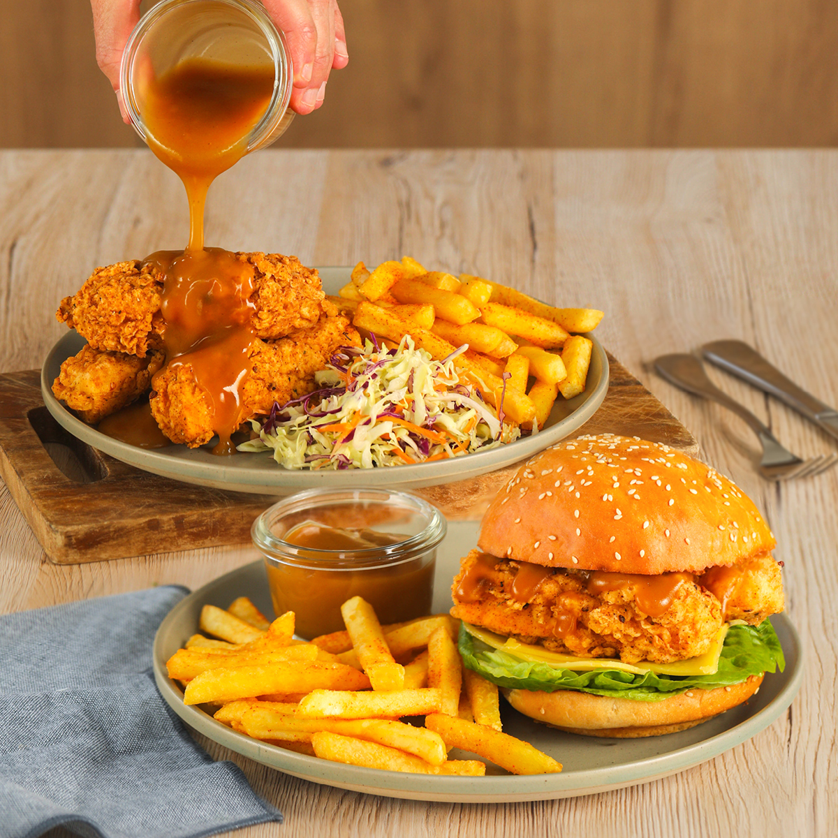 The comfort combo you didn’t know you needed! Crispy chicken strips or a crispy chicken burger, all made better with a hearty pour of gravy.